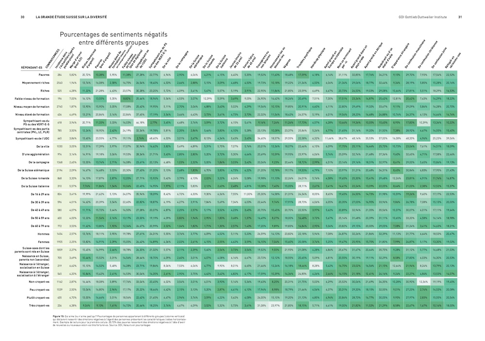 La diversité fait partie intégrante de la Suisse: 26 cantons, 4 langues nationales et une multitude de cultures et de modes de vie coexistent et se côtoient. Mais à quel point l’environnement social de la population en Suisse est-il varié et panaché? Pour répondre à cette question, le Pour-cent culturel Migros a chargé l’Institut Gottlieb Duttweiler (GDI) de réaliser une étude représentative. Les caractéristiques analysées reposent sur l’article 8 de la Constitution fédérale relatif à l’égalité des droits et à la non-discrimination: l’origine, le sexe, l’âge, la langue, la situation sociale, le mode de vie, les convictions religieuses, philosophiques et politiques ainsi que les handicaps physiques, mentaux ou psychiques.
