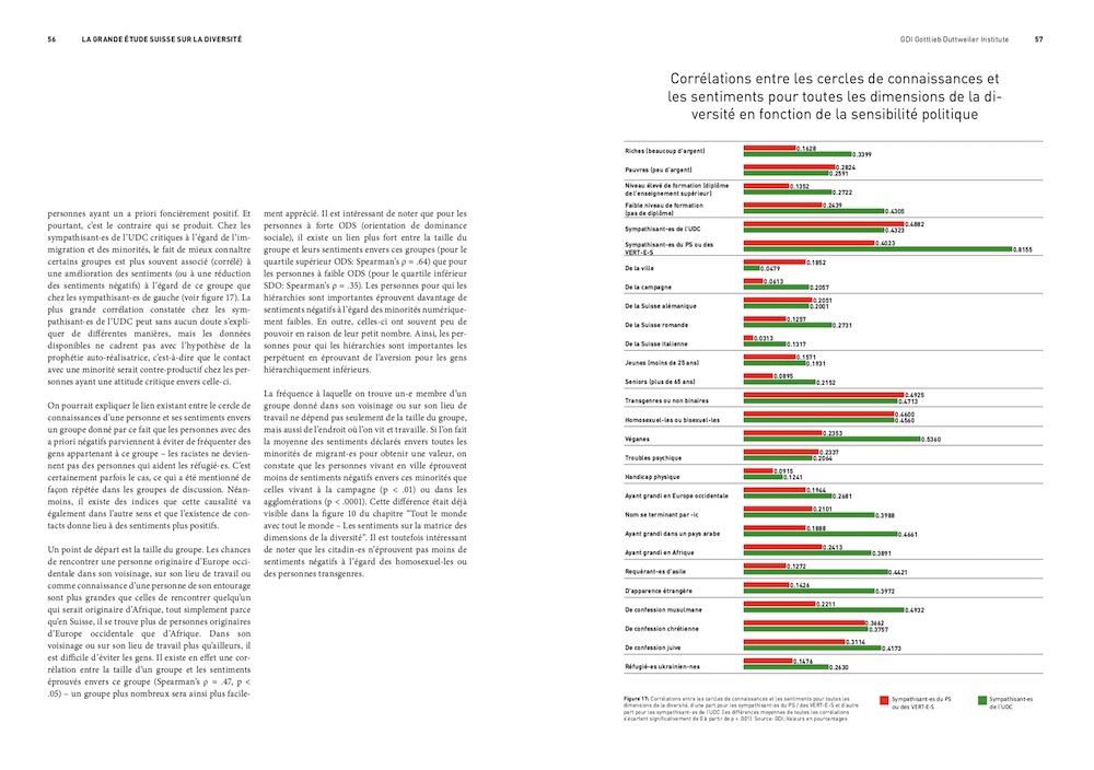 Les personnes qui sont plus souvent en contact avec différents groupes ont une attitude plus positive envers ces groupes. Selon l’enquête, 56% des participant-es pensent, du moins en partie, qu’une communauté peut supporter de grandes différences, par analogie avec les groupes interrogés. De plus, 69% estiment que la diversité des perspectives et des expériences de vie permet de prendre de meilleures décisions.