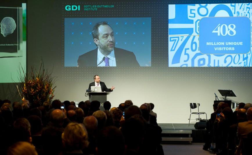 Wales erhielt den renommierten Preis für seine Verdienste um die Demokratisierung des Wissenszugangs. Überreicht wurde die mit 100'000 Franken dotierte Auszeichnung von Gisèle Girgis, Mitglied der Generaldirektion des Migros-Genossenschafts-Bundes. Sie erinnerte in ihrer Rede an den aufklärerischen Enzyklopädisten Denis Diderot und verglich Jimmy Wales mit ihm: «Beide vertrauen auf die Macht der kritischen Öffentlichkeit.»